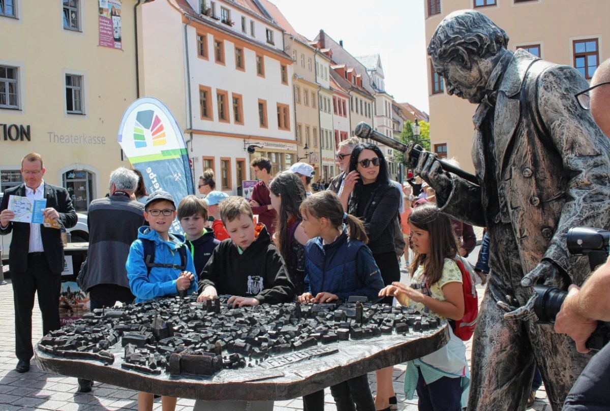 Der Enthüllungsrundgang startete am Rathaus mit „Ottos Löwen“. Joscha Bender, der die Skulptur schuf, war aus Mönchengladbach zur feierlichen Enthüllung angereist. Endlich hat Freiberg einen Löwen, bei dem es auch das Ordnungsamt gern sieht, wenn Besucher ihn berühren oder gar auf ihm reiten.
