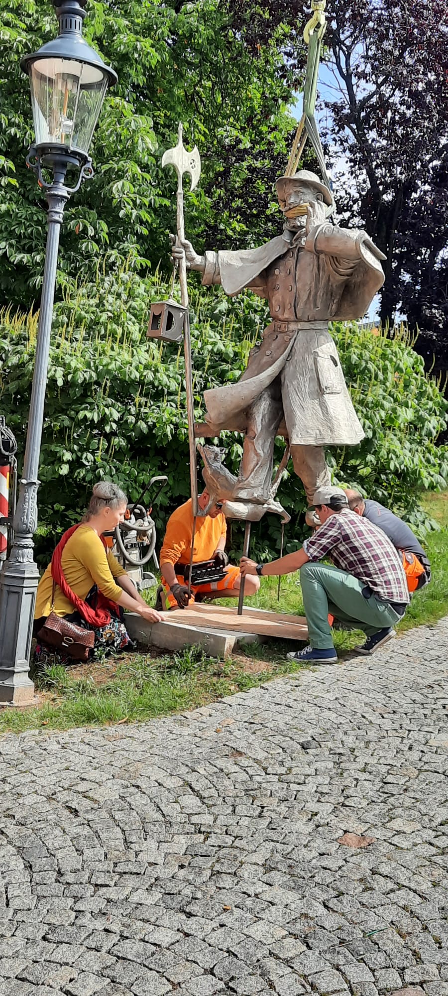 Der Entdecker auf Reisen und der Türmer an der Petrikirche wurden bereits im April aufgestellt. Im Mai kamen die Schauspielerin am Theater und der Glückliche Bergmann am Schüppchenberg hinzu.